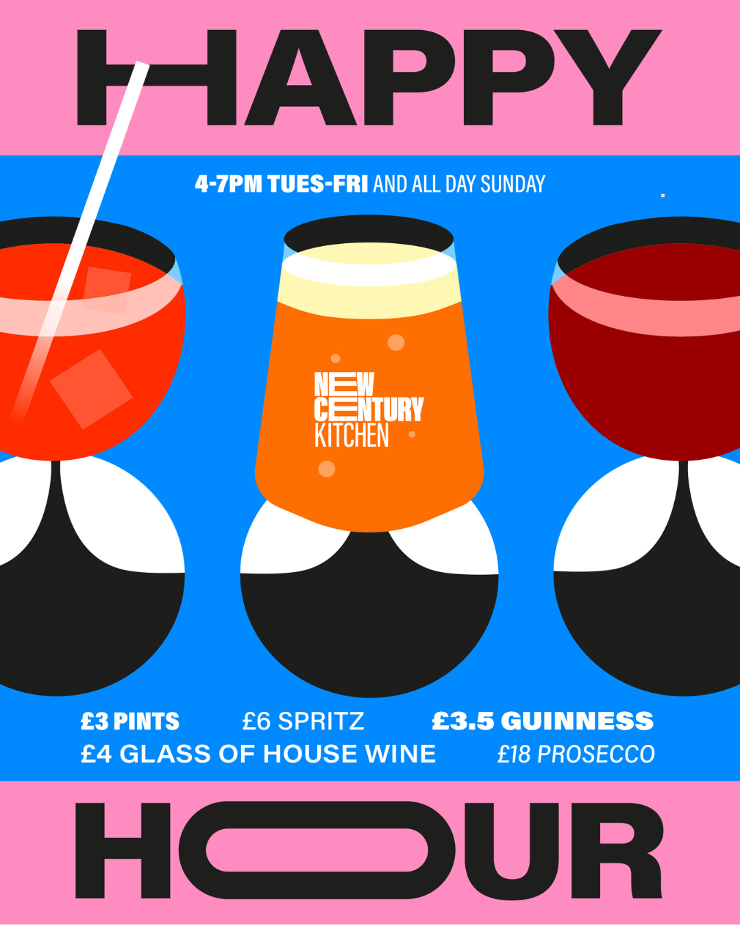 WEEKDAYS 4-7PM + ALL DAY SUNDAY. Enjoy £3 pints of New Century Lager, IPA and Aspall’s Cider, £3.50 Guinness, £4 house wine, £6 Spritz and £18 Prosecco.