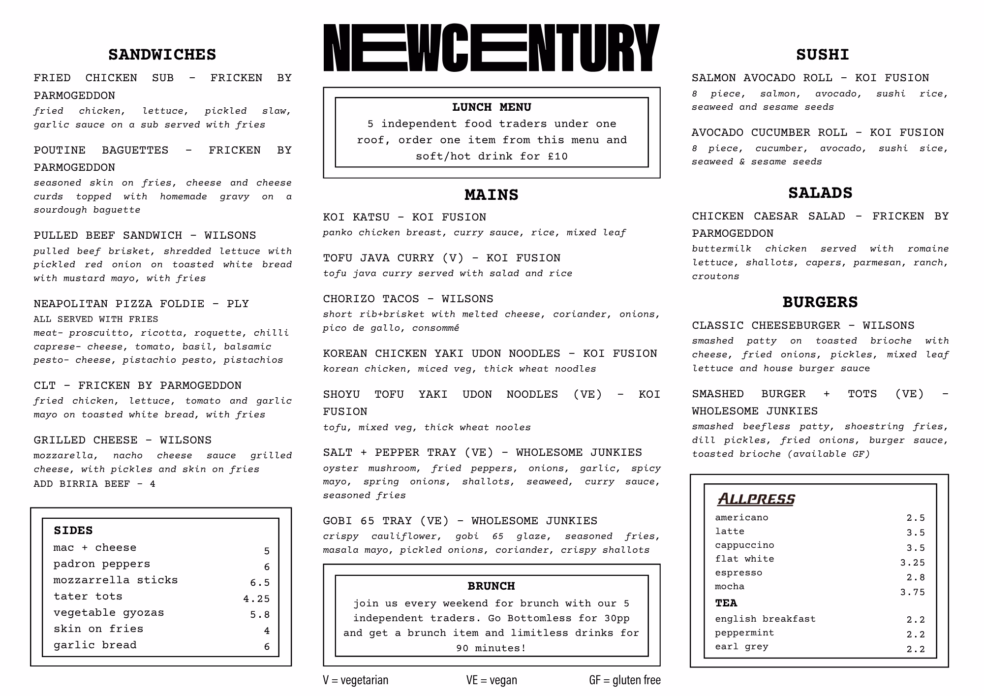 FOOD AND DRINK. Five independent traders under one roof. Enjoy some of the best food and drink Manchester has to offer in New Century Kitchen – a laidback space that oozes the same mid-century charm of the upstairs Hall. From fried chicken and pizza to sushi and ramen, there’s something for everyone. Check out our current traders below.